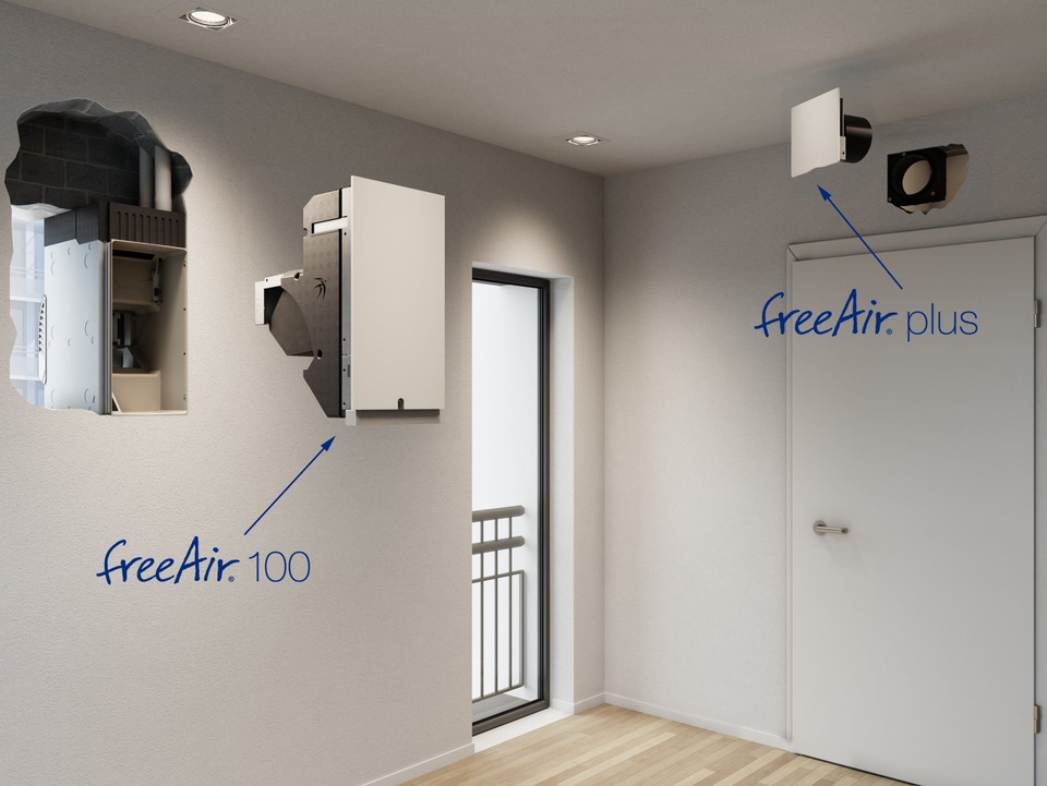 La solution préférée des architectes sans grilles en façades. Une solution qui permet d'éviter les traces de moisissures sous les grilles en façade. La ventilation à récupération de chaleur décentralisée bluMartin freeAir permet de ventiler un logement complet sans rajouter une quantité importante de gaines. Une solution qui permet de garantir une parfaite qualité d'air intérieure et un meilleur confort sans courants d'airs froids tout en réduisant la consommation énergétique.